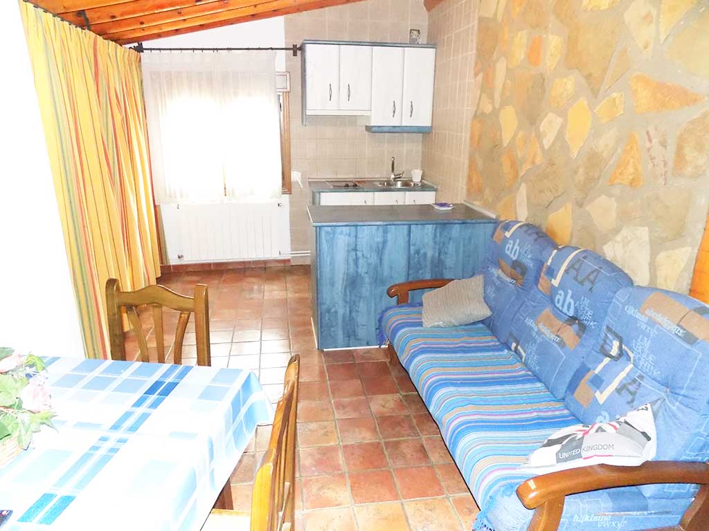 En esta ocasión predominan los colores azules en la zona del salón-cocina. Un sillón de ese mismo color y de 3 plazas se sitúa junto a la barra americana de la cocina. Idóneo para apoyar vuestra bebida mientras estáis sentados allí tranquilamente. Detrás del sillón hay una parte de la pared con un acabado de piedras.